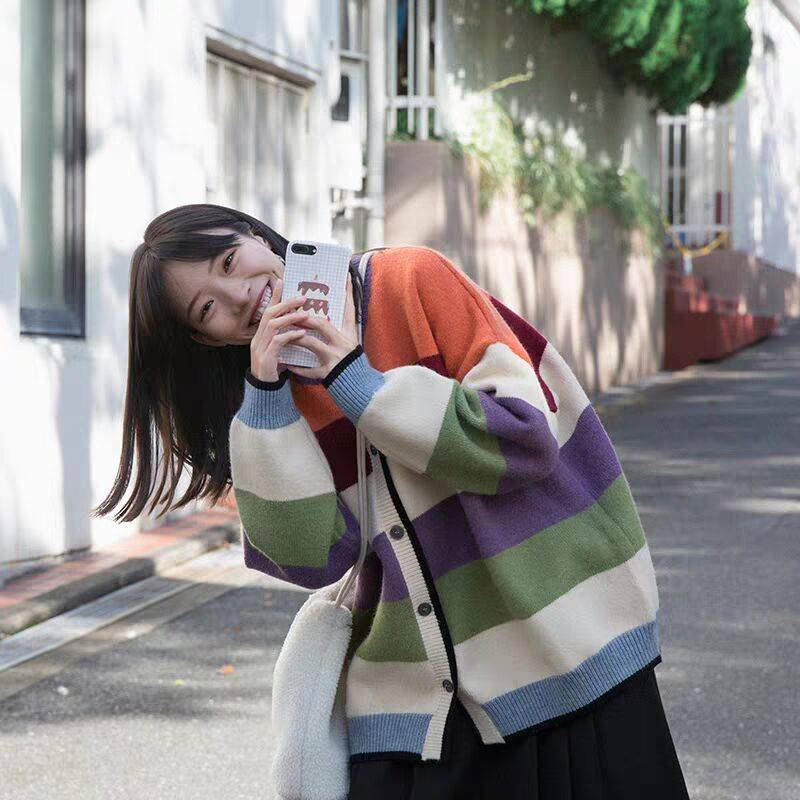 奶兔星球日系彩虹条纹针织开衫撞色包边毛衣外套女秋冬外穿