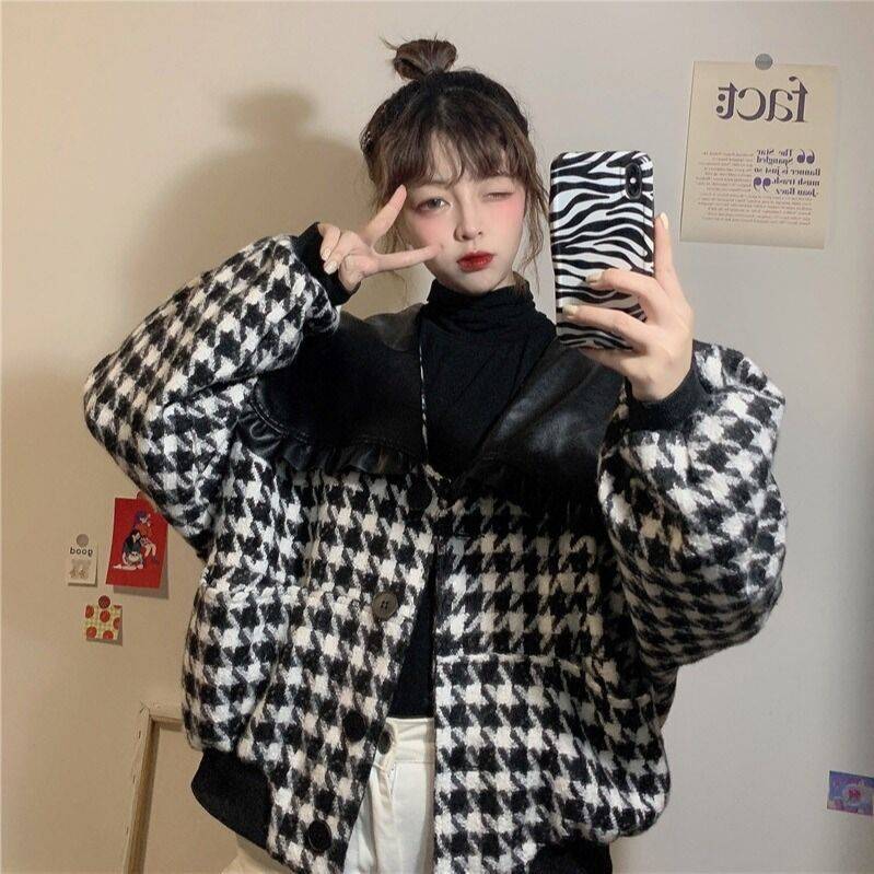 小香风PU皮海军领粗花呢子千鸟格外套女秋冬新款上衣满100减20