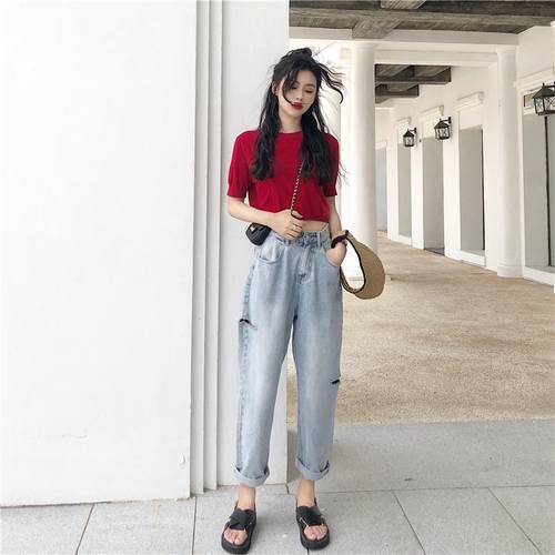 浅色卷边破洞牛仔裤女夏薄宽松韩版显瘦高腰萝卜灯笼裤九分哈伦裤