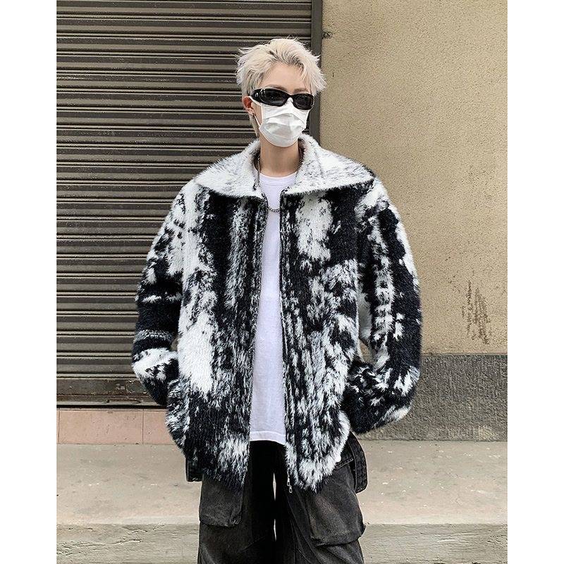 秋冬美式复古扎染渐变毛绒绒开衫外套男仿貂毛拉链小众高级感毛衣