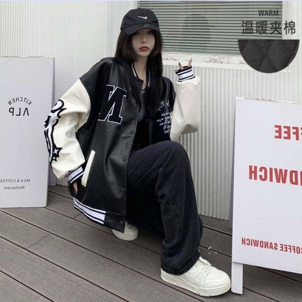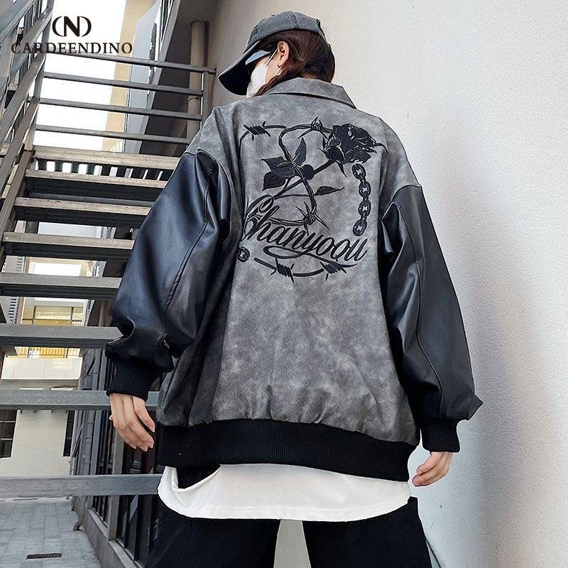 春秋美式复古麂皮绒拼接PU皮衣外套男女oversize百搭棒球服夹克潮