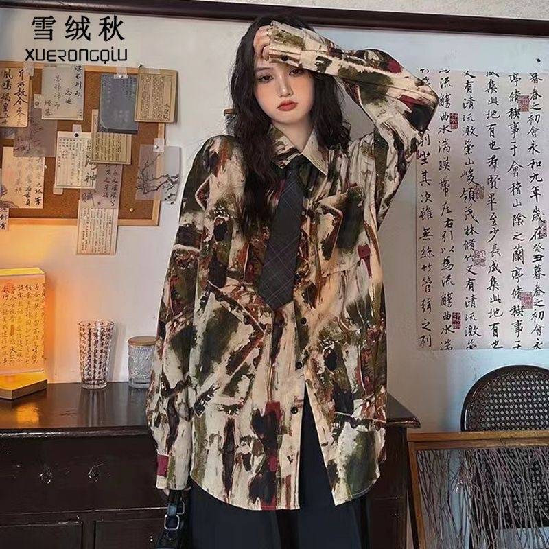 XUERONGQIU港风个性宽油画新款秋季美式复古衬衣上衣领带长袖衬衫