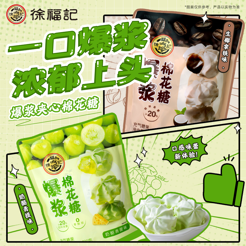 徐福记爆浆夹心棉花糖190g生椰拿铁奶酪青提软糖休闲零食绵软浓郁