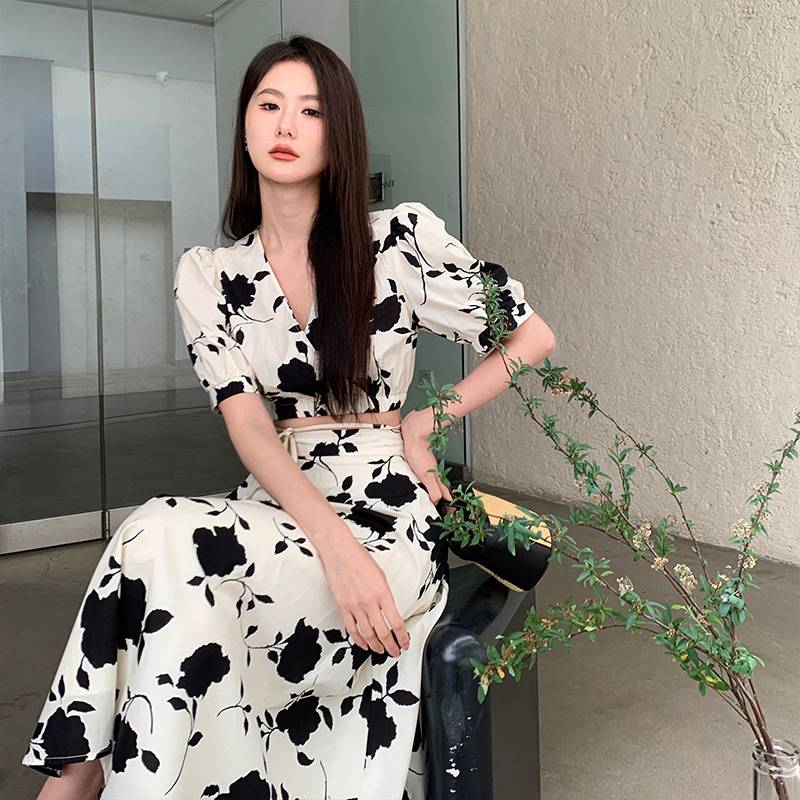 秀熙熙2023夏季新款V领短款短袖上衣高腰半身裙子两件套装女9629