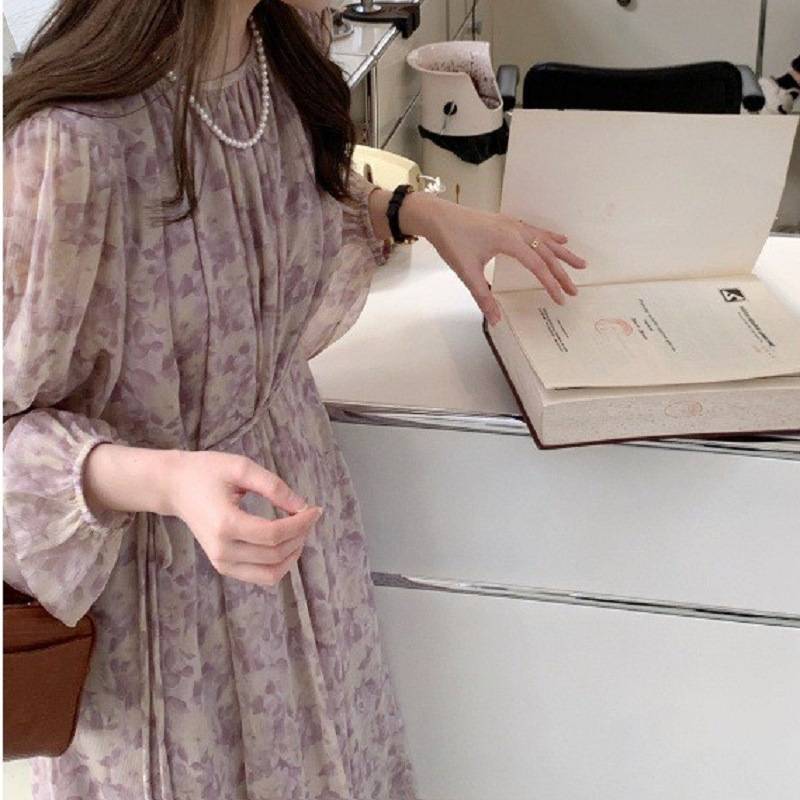 早春款女装2023年新款温柔风茶歇法式气质收腰紫色碎花连衣裙