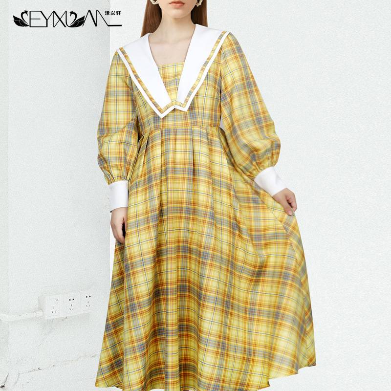 春夏新款女装连衣裙 长款学生领长款格子泡泡袖连衣裙 女装连衣裙