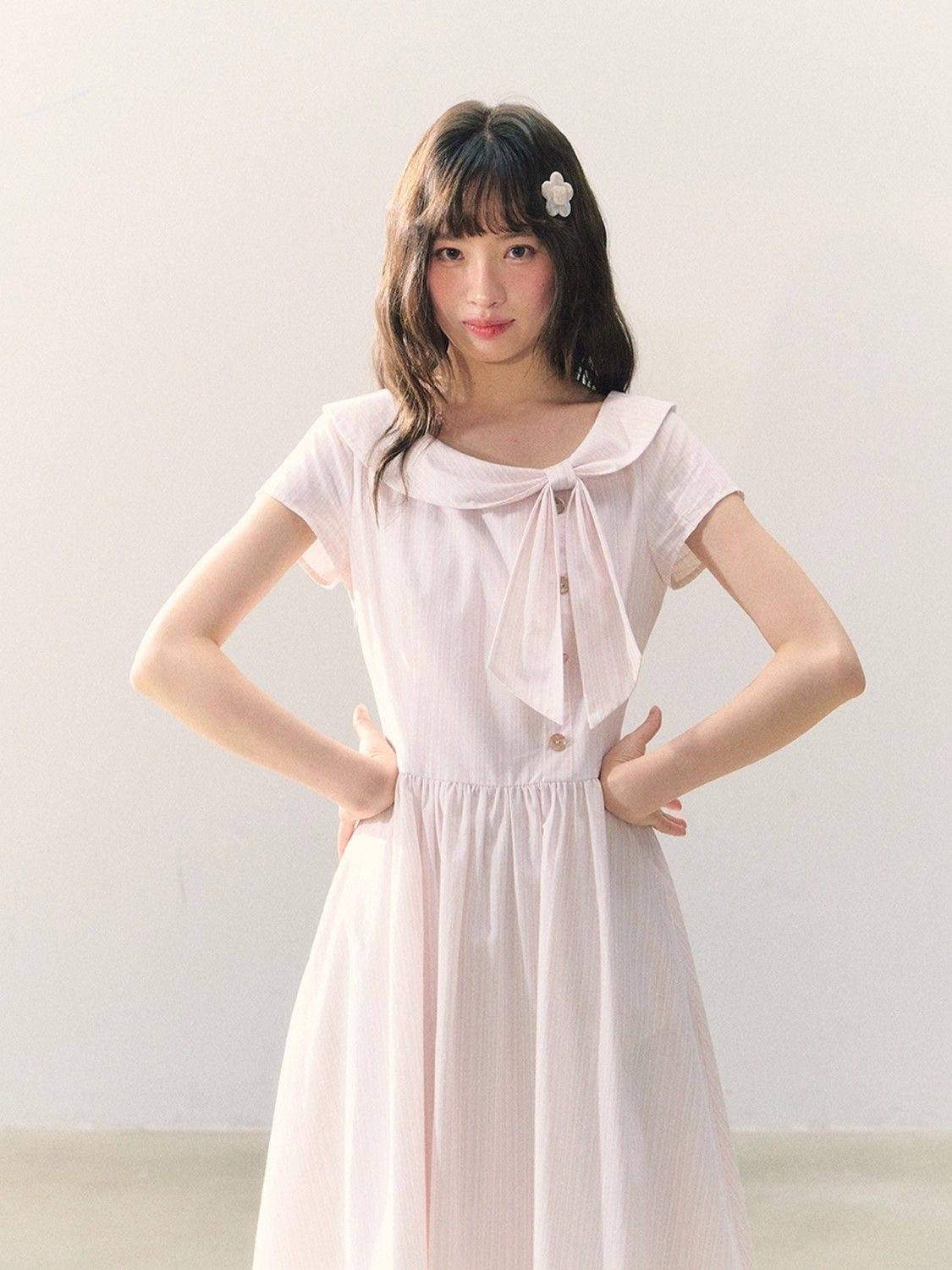 桃雾信笺 清新少女感粉色条纹蝴蝶结领子收腰连衣裙夏季中长裙女