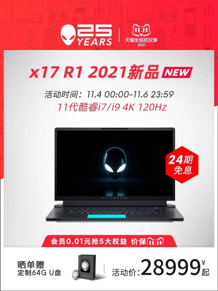 【24期免息】ALIENWARE外星人全新x17 R1笔记本电脑11代英特尔酷睿i9旗舰3080游戏轻薄17.3英寸Cherry键盘4K