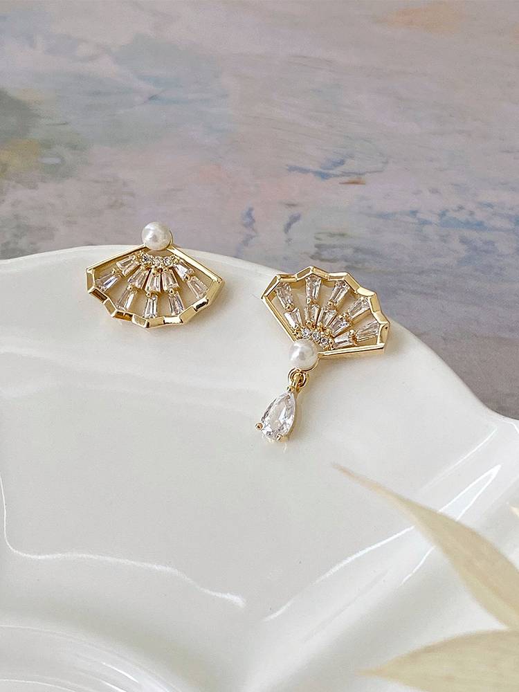 七里 轻罗小扇耳钉2020年新款潮珍珠锆石个性国风不对称纯银耳环