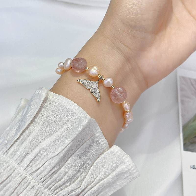 闺蜜人鱼尾手链女学生淡水珍珠手绳招桃花草莓晶粉晶珠子串珠手串