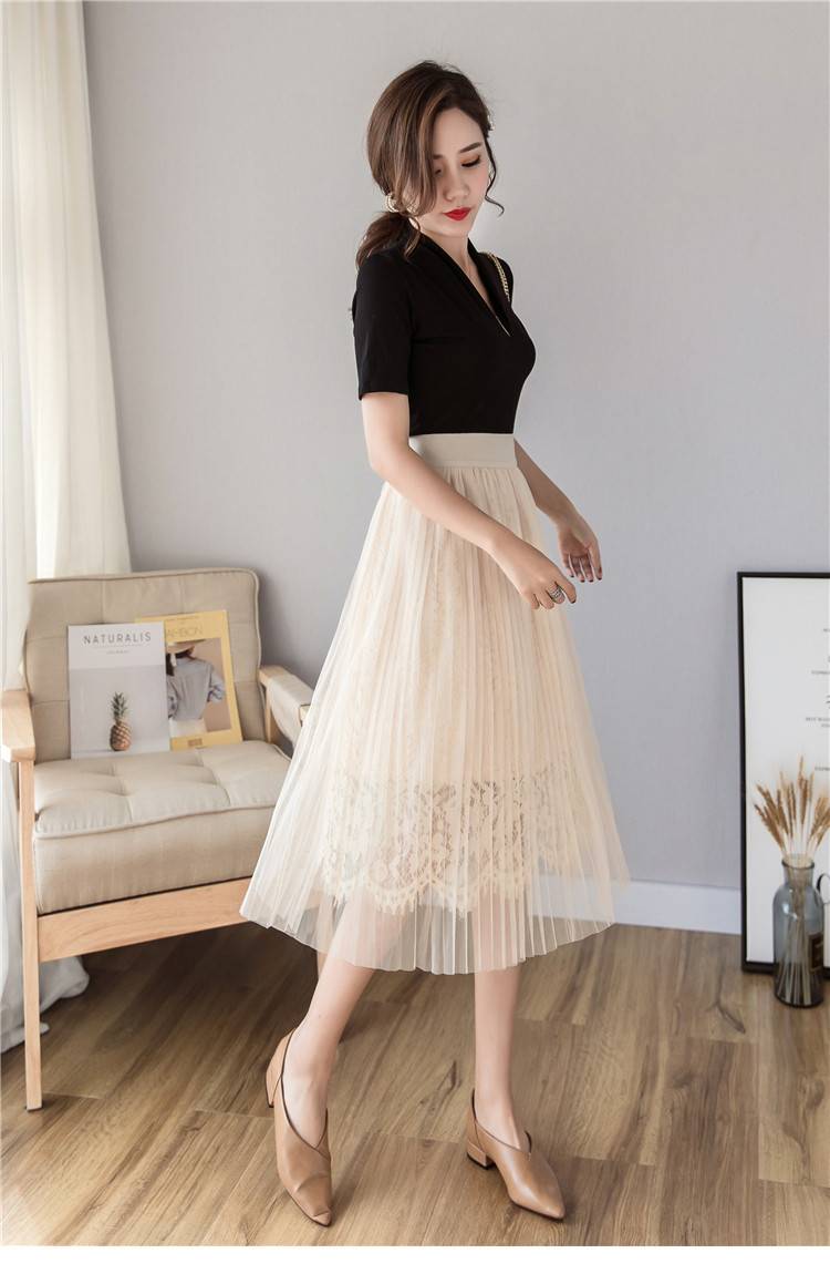 2020夏季蕾丝半身裙女百褶纯色网纱裙A字中长款