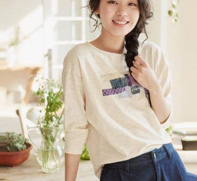 女装春秋新款文艺几何印花纯棉圆领落肩七分袖T恤女宽松上衣