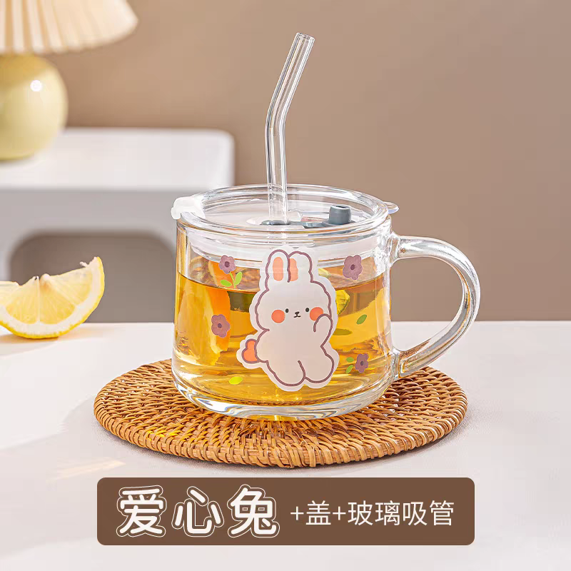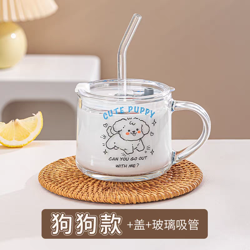 ins玻璃杯早餐杯吸管水杯带把手大容量加盖勺卡通少女心情侣闺蜜
