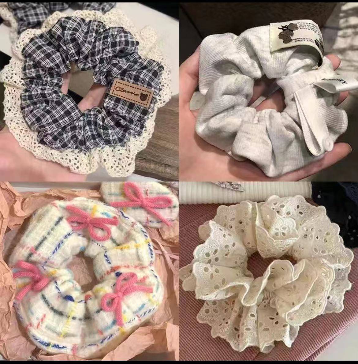 ins风高颜值英伦风学院风蓝色格纹发圈洋气法式复古蕾丝大肠圈