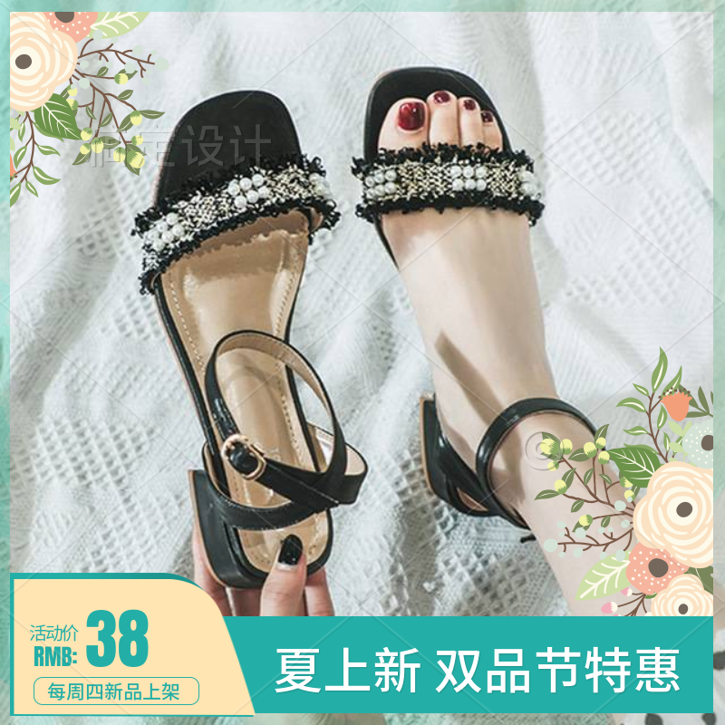夏季2021新款欧美时尚珍珠碎花带时装单鞋粗跟浅口女鞋