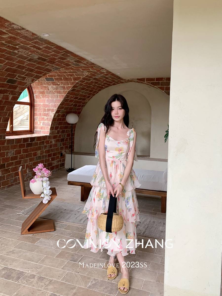 中长款小清新雪纺印花吊带连衣裙女夏甜美碎花蛋糕