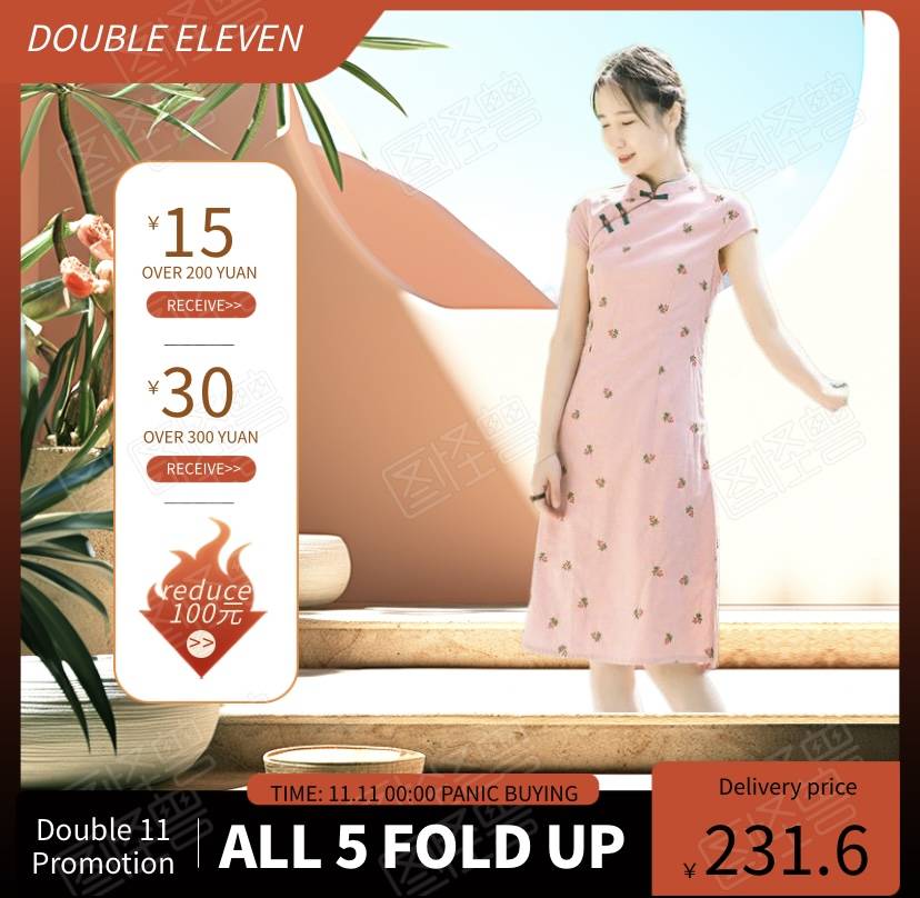 2024 夏季新款 中式复古绣花棉麻旗袍 中长款修身连衣裙