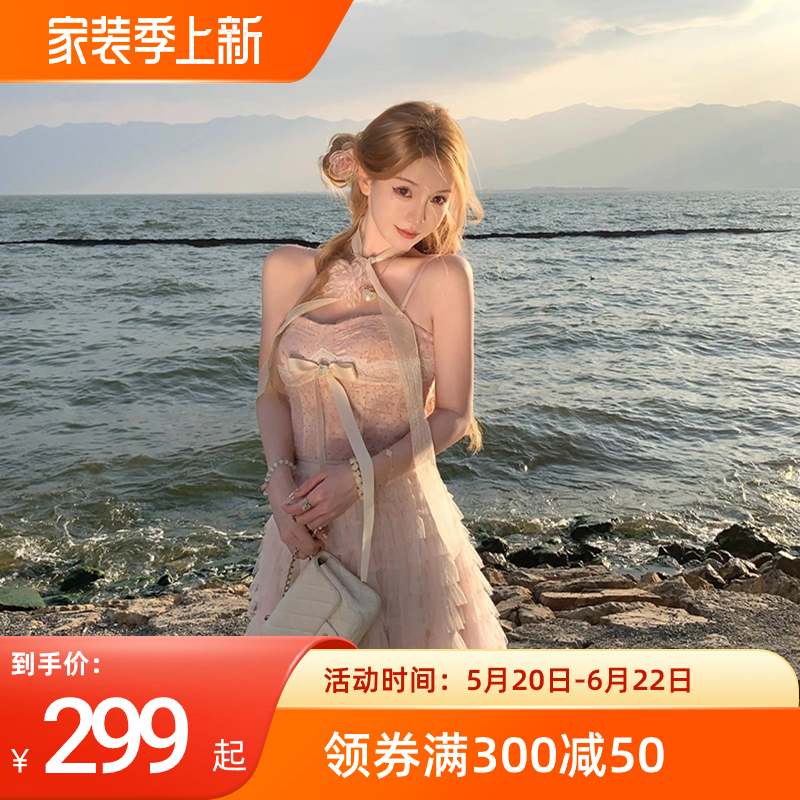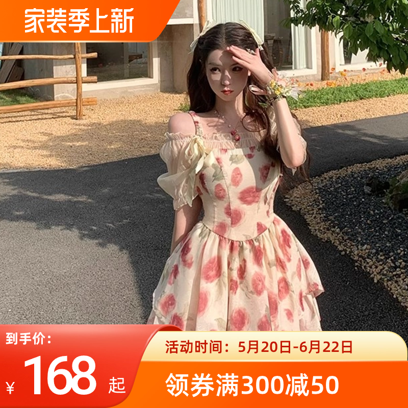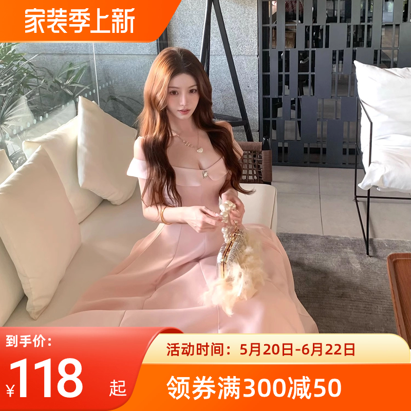 肉粉色法式吊带裙小个子一字肩收腰连衣裙2024