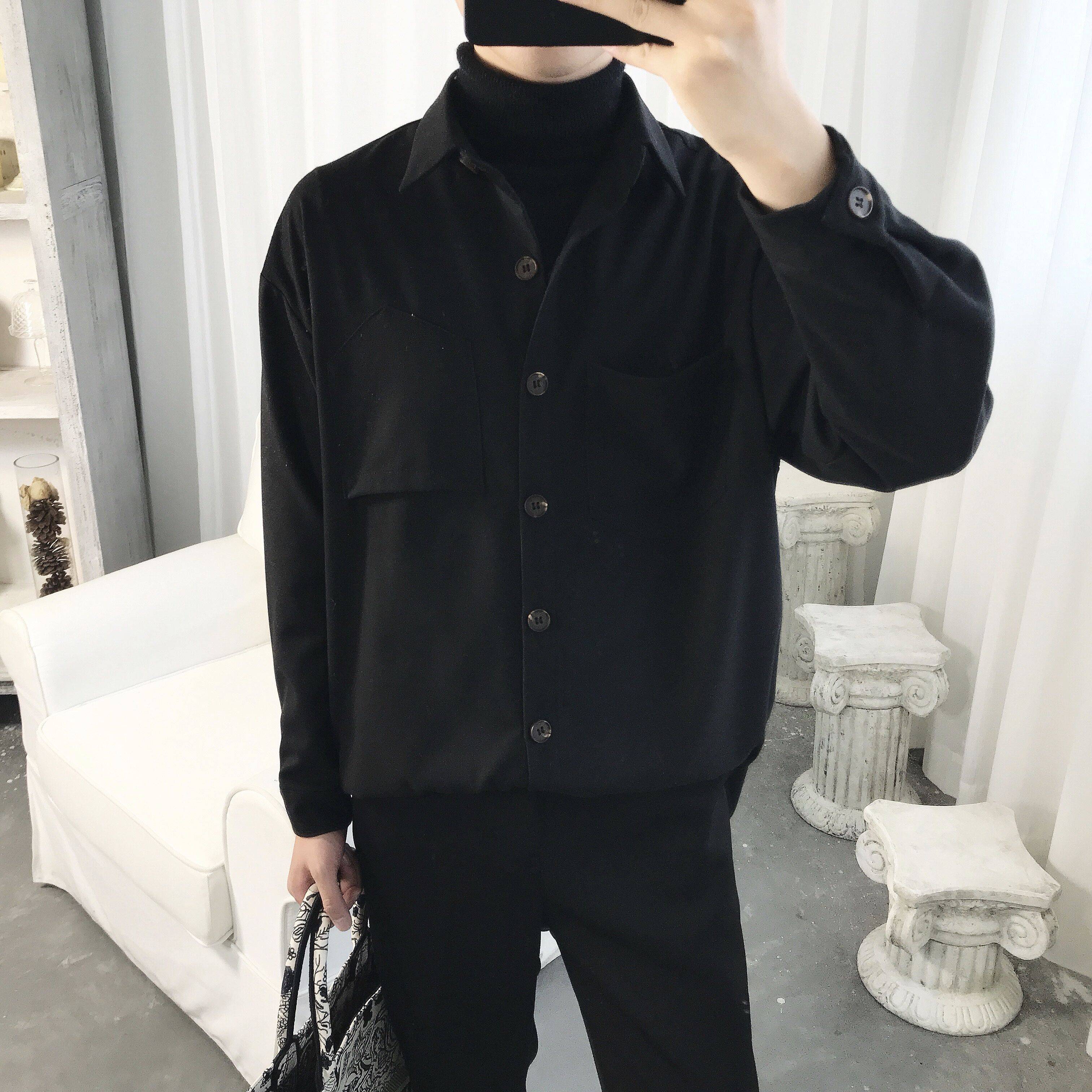 2018冬季新款三色毛呢加厚设计感口袋秋冬打底长袖衬衫