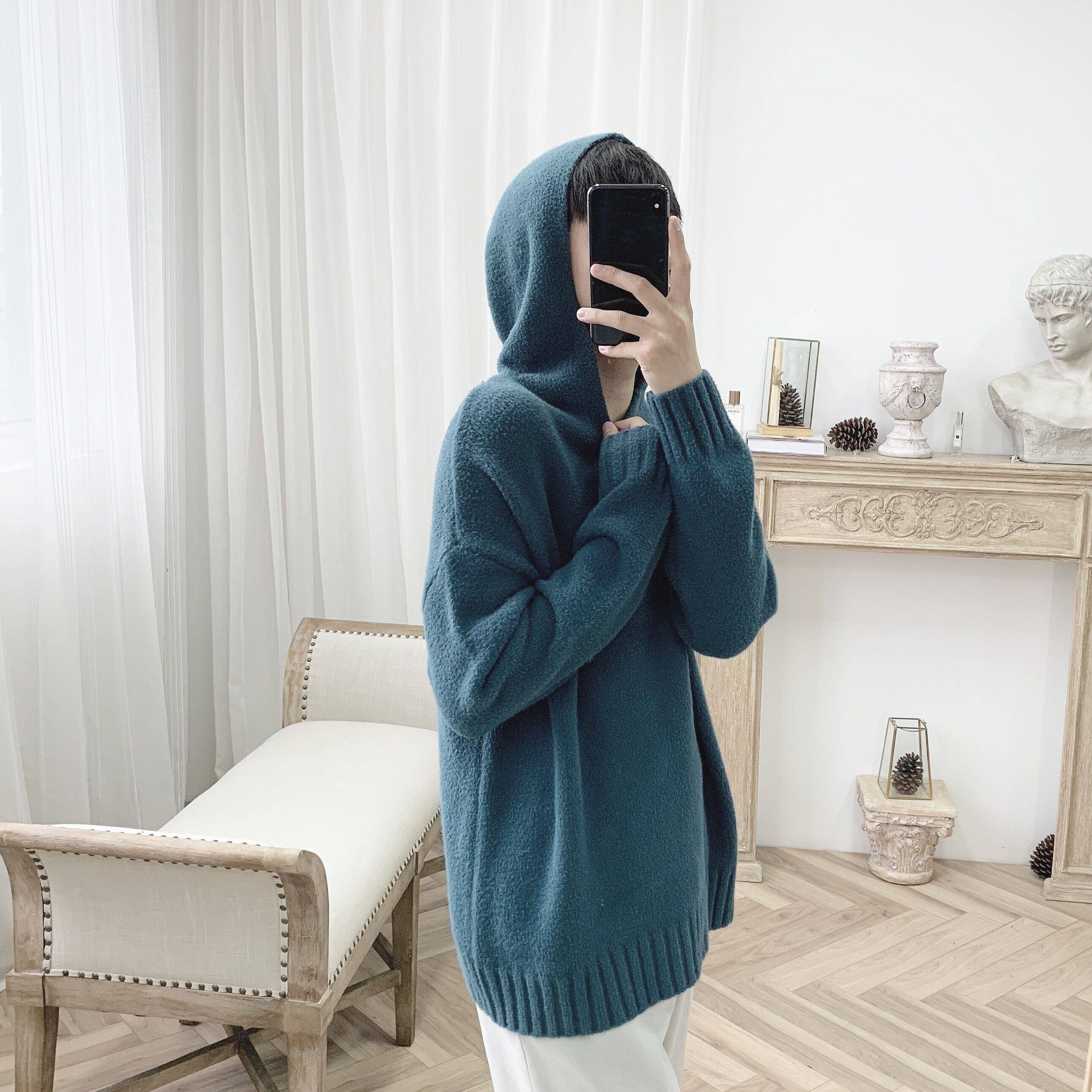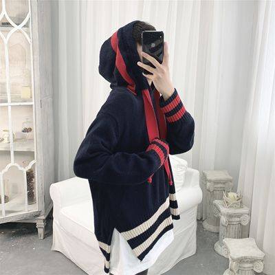 两色顺滑温柔感韩版学院风连帽套头针织毛衣卫衣