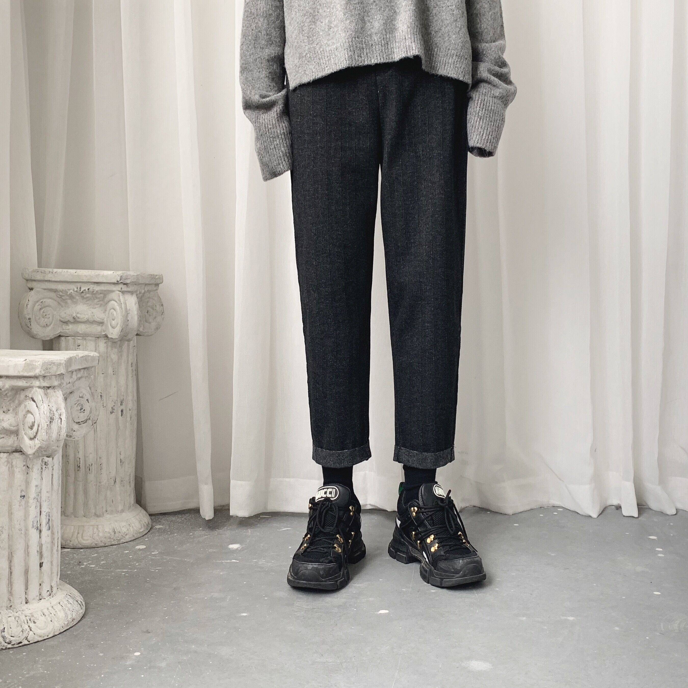 气质人字纹韩版学院风宽松抽绳松紧翻边秋冬休闲裤