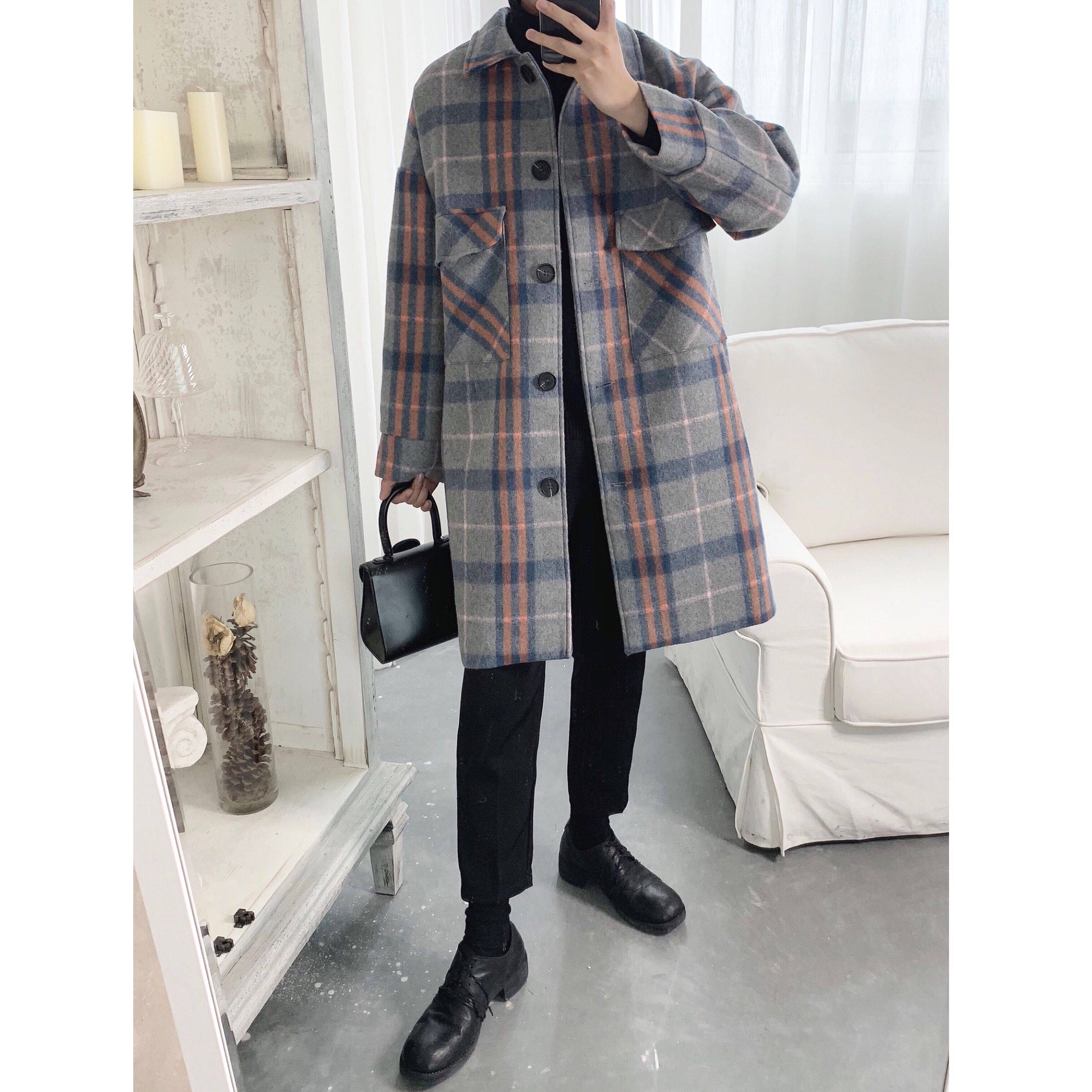 英伦学院风格纹韩版气质中长款秋冬外套男毛呢大衣