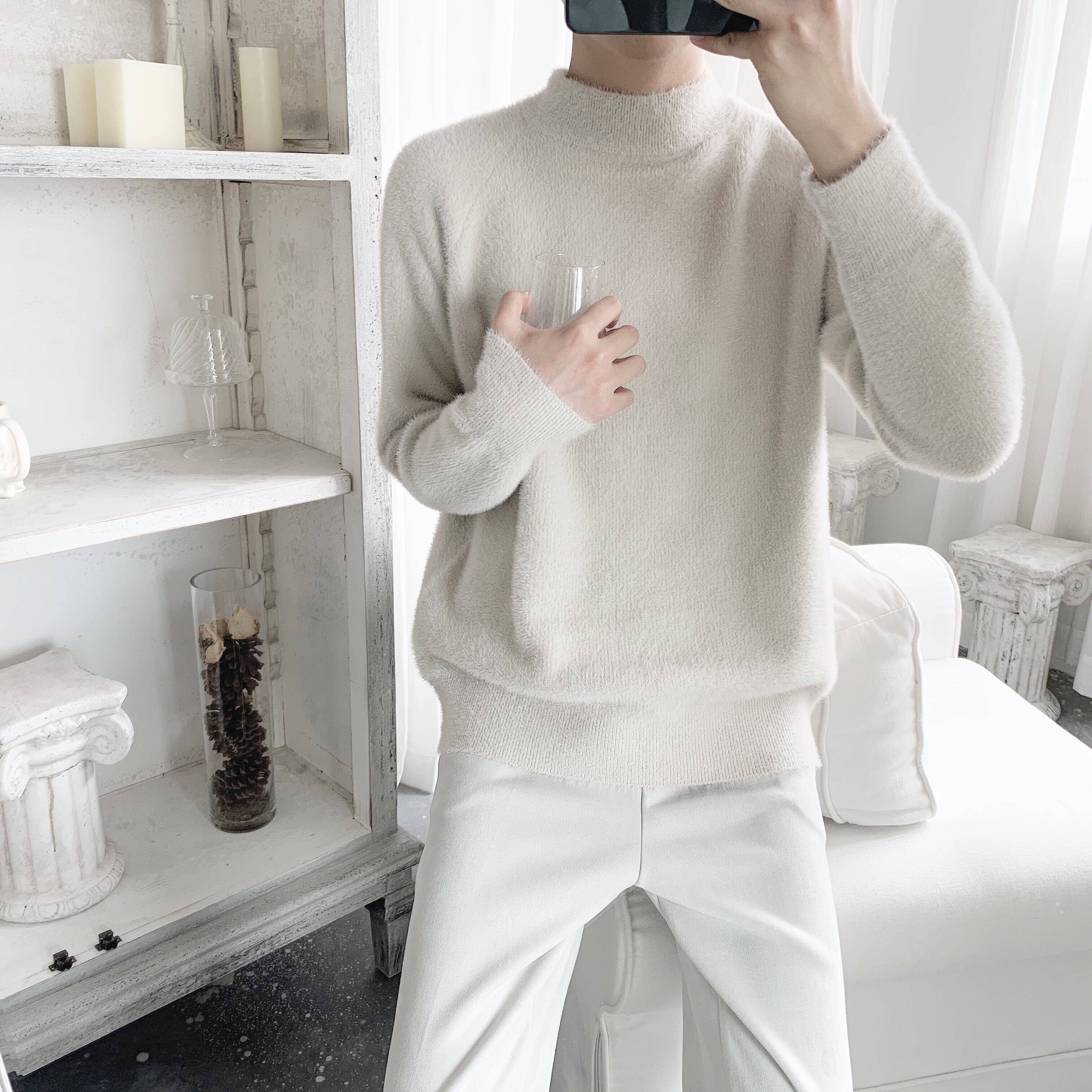 自制款温柔感韩风杏灰色毛绒绒的顺滑圆领套头打底毛衣