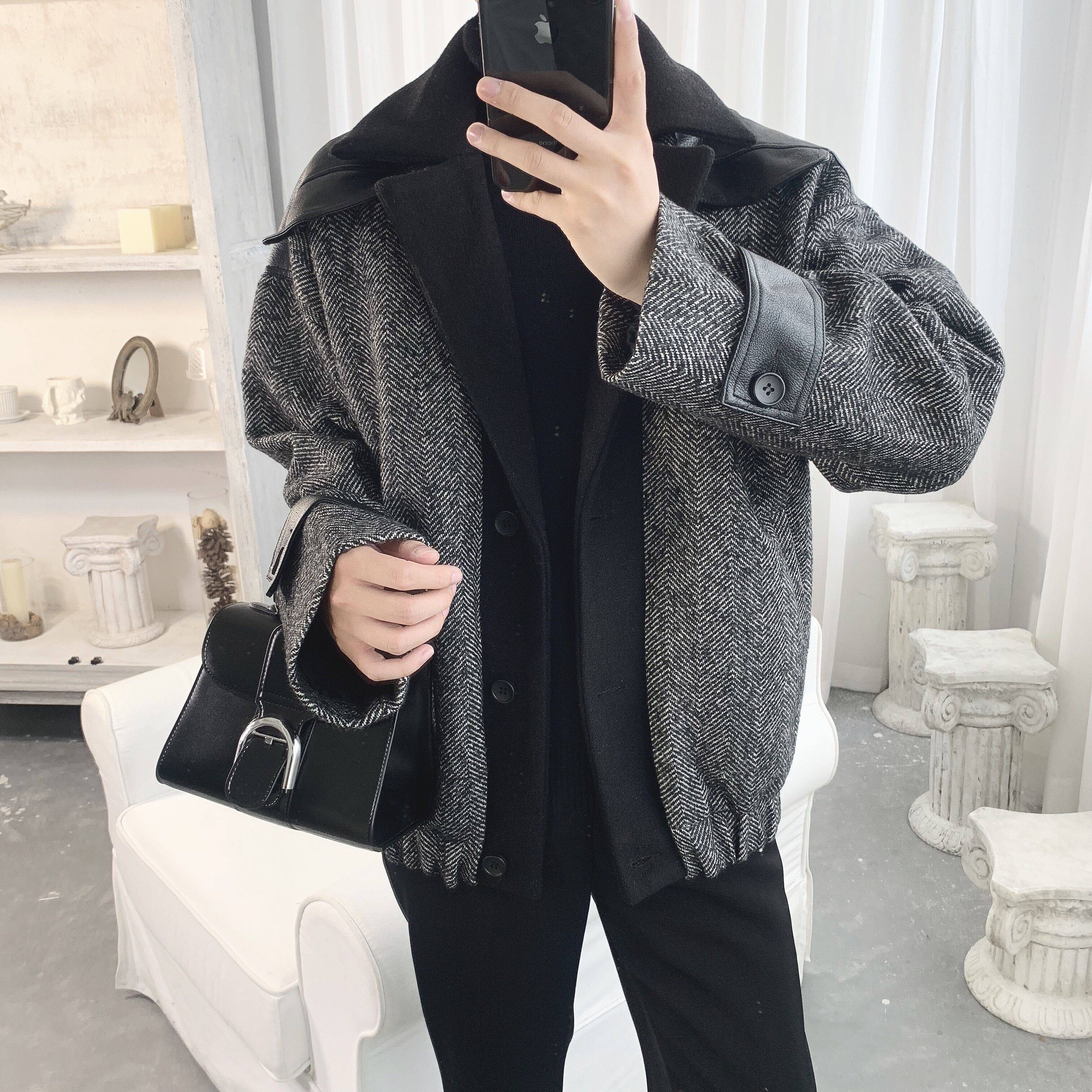基础款黑色翻领人字纹拼接款街头风气质秋冬外套男夹克