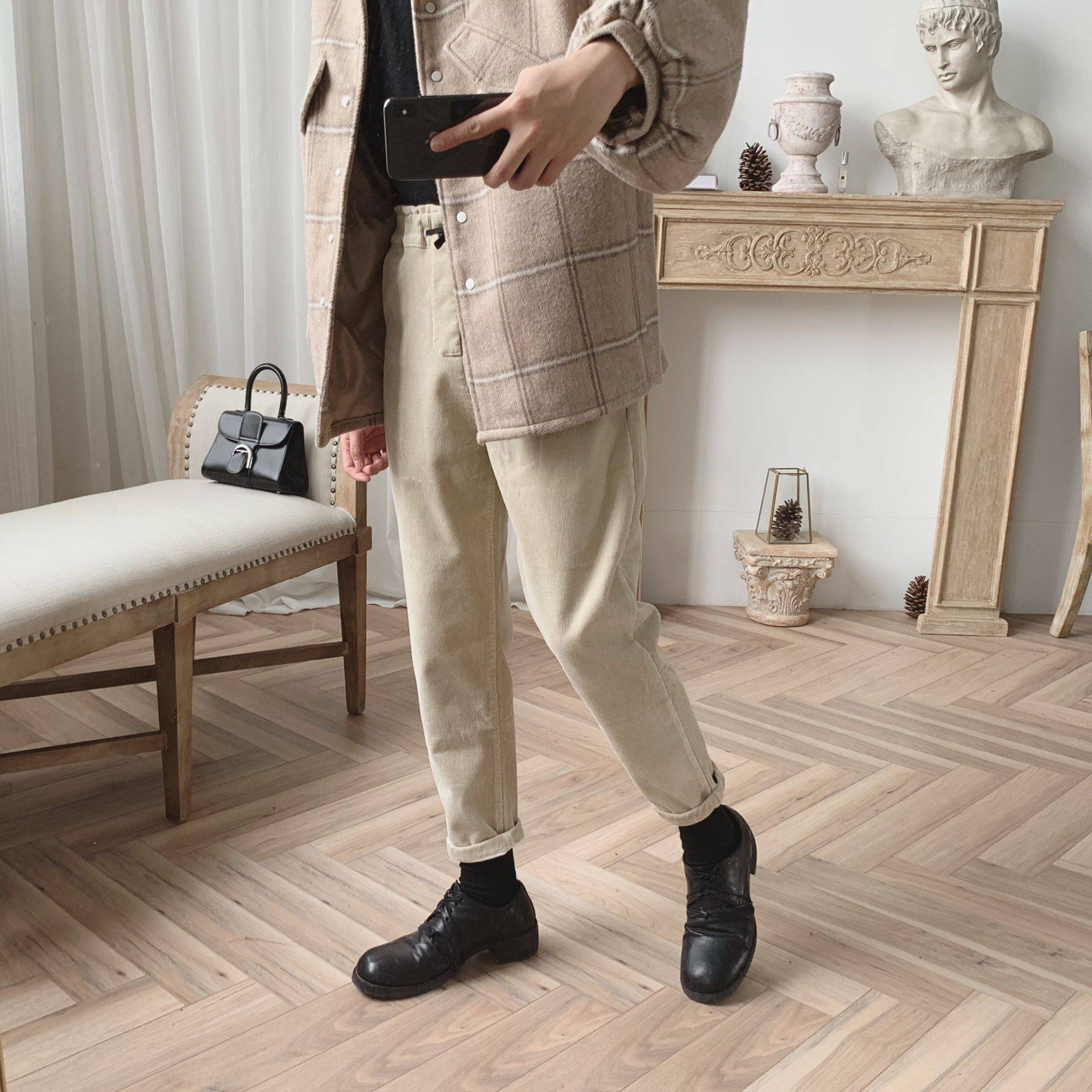秋冬慵懒风卡其色灯芯绒韩版抽绳松紧腰秋冬九分休闲裤