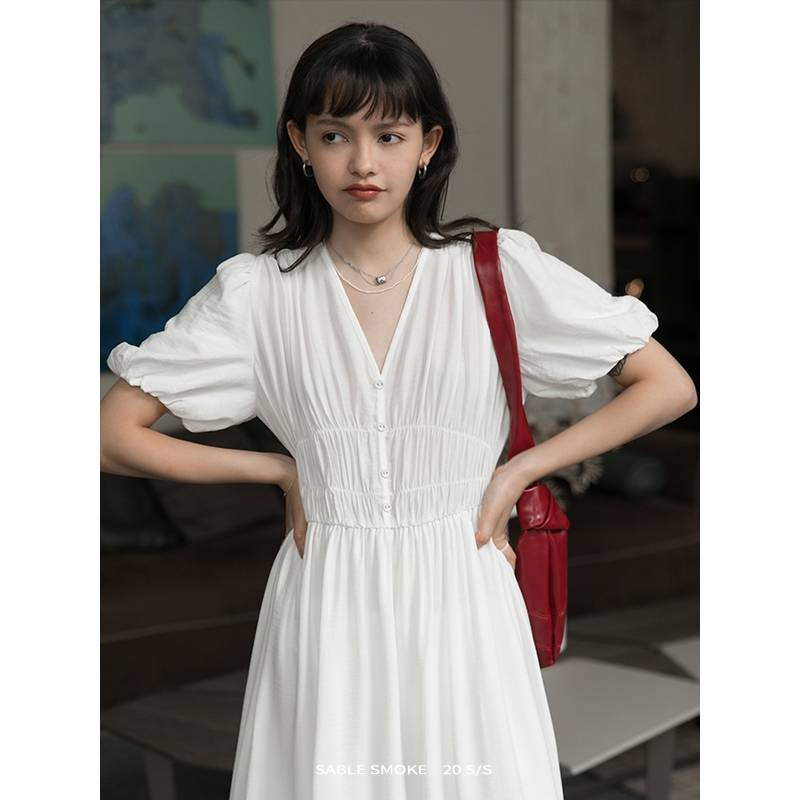 法国小众桔梗裙子女2021夏装新款气质V领单排扣雪纺短袖连衣裙女