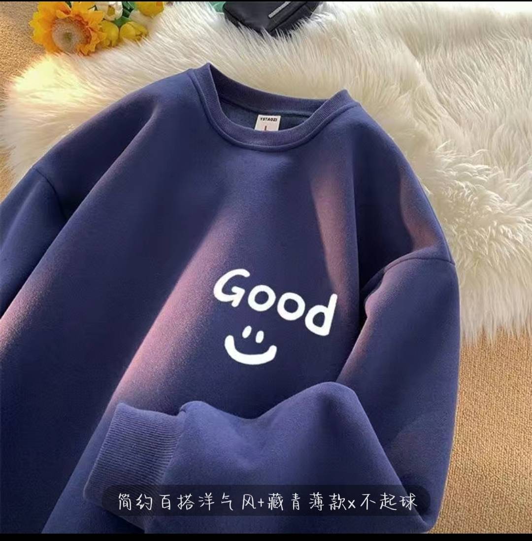美拉德个性卫衣女春秋薄款外套无帽ins重磅圆领加绒美式复古外套