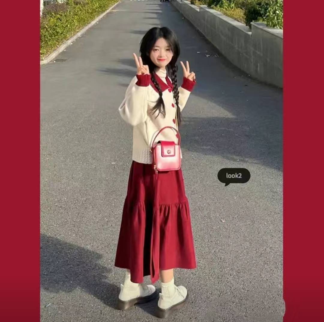 秋冬过年套装裙一整套甜美温柔娃娃领毛衣女穿搭半身裙子两件套装