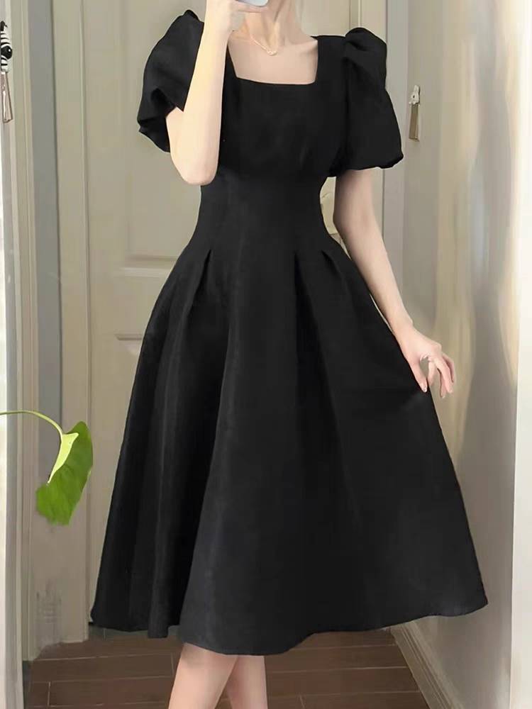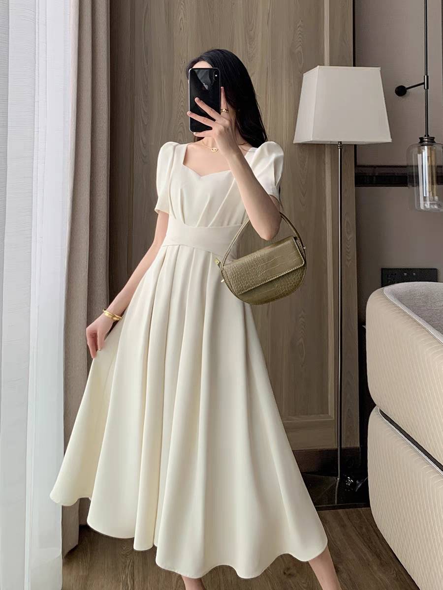 方领连衣裙女2023夏新款法式收腰显瘦温柔风奶白色长裙子