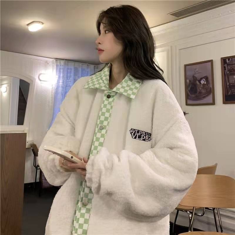 棋盘格棉服oversize女潮冬小个子设计感两面穿羊羔毛日式棉衣棉袄