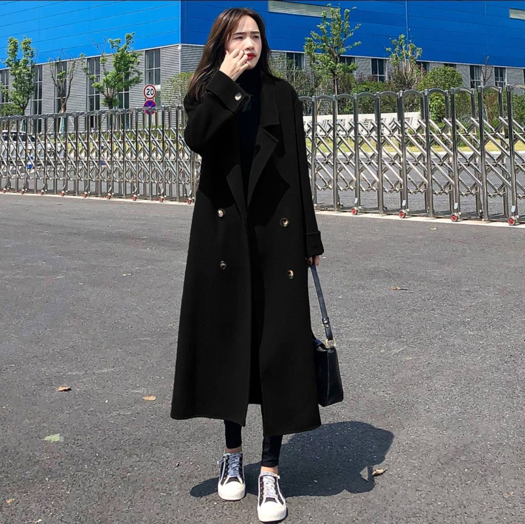 黑色大衣女2021冬装新款赫本风宽松休闲时尚简约过膝长款毛呢外套