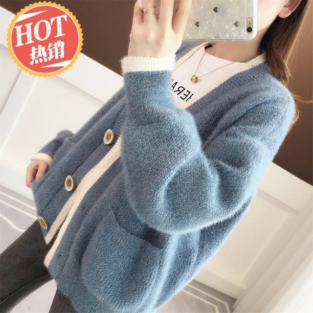 针织毛衣女秋冬新款女装撞色宽松长袖加厚V领开衫外套女