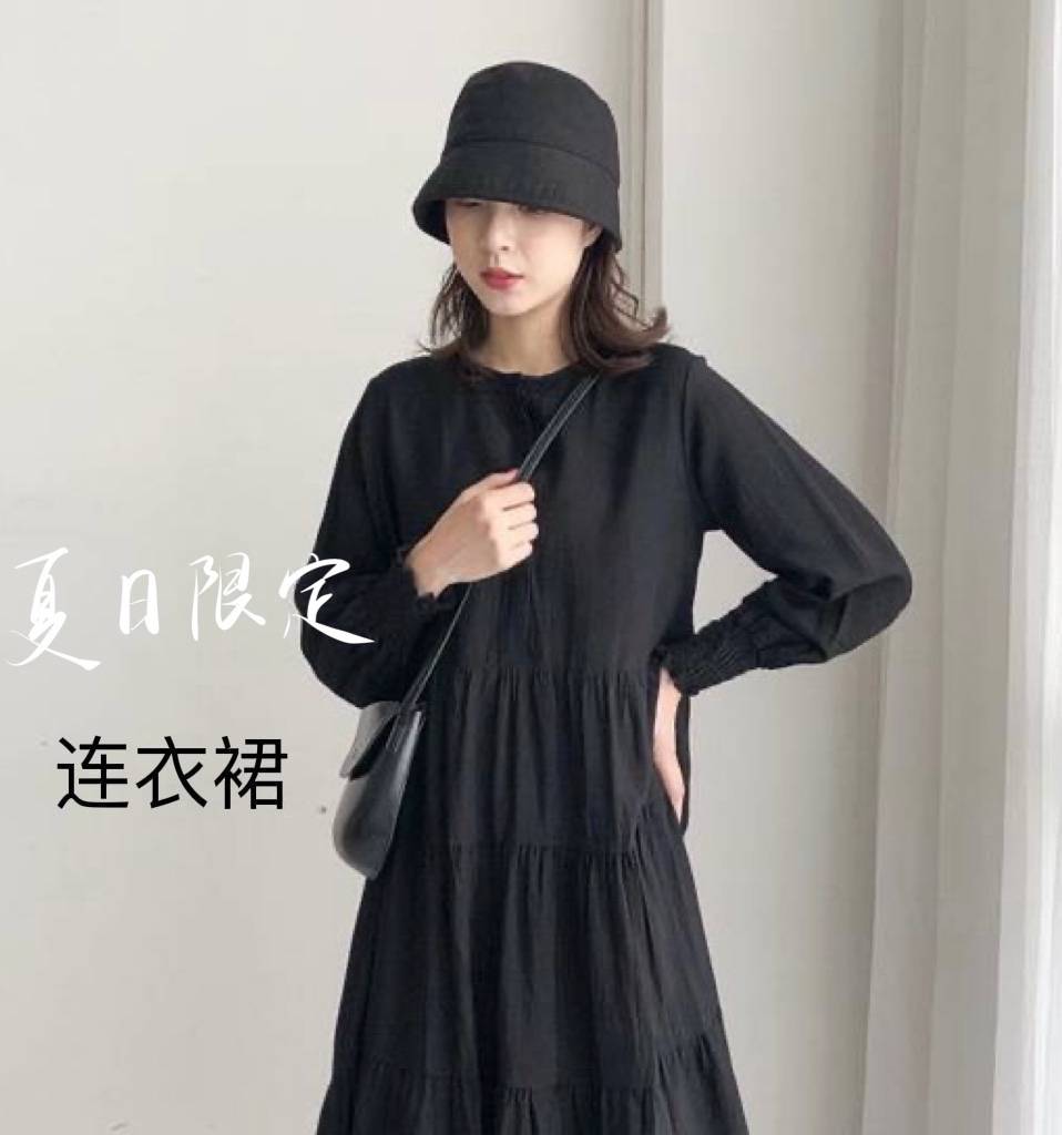 法式复古长袖连衣裙新款早秋韩国黑裙宽松女装