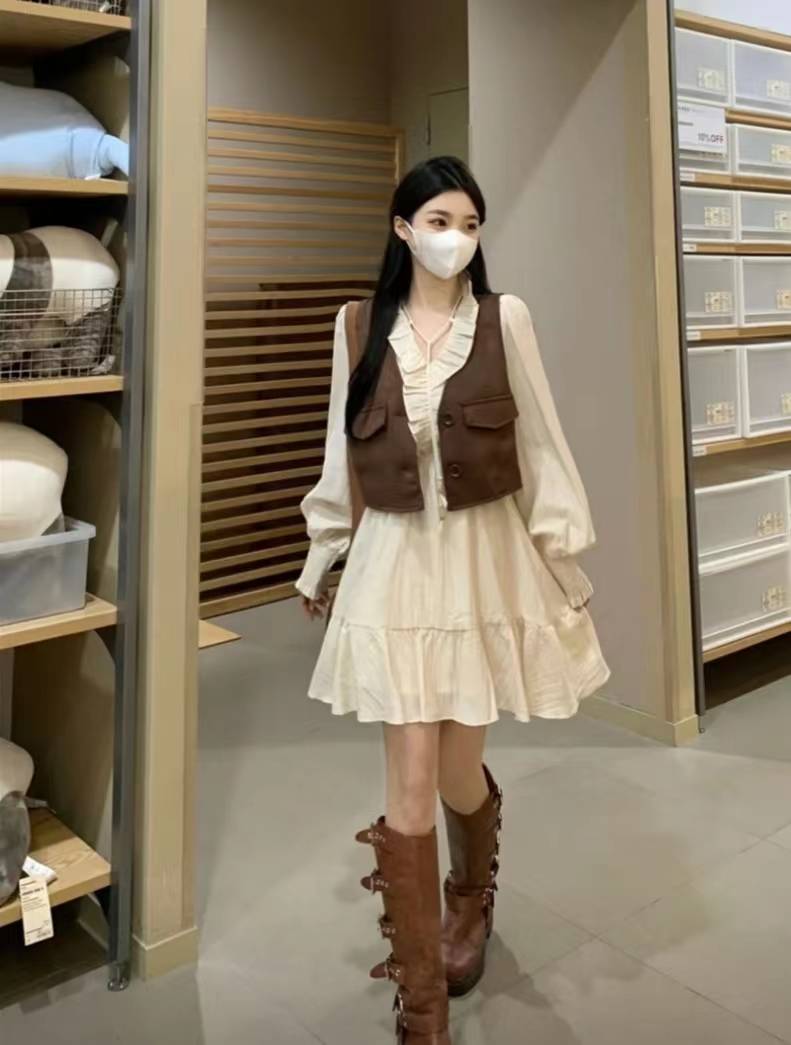 大码女装法式高级感长袖V领连衣裙马甲套装秋季新款