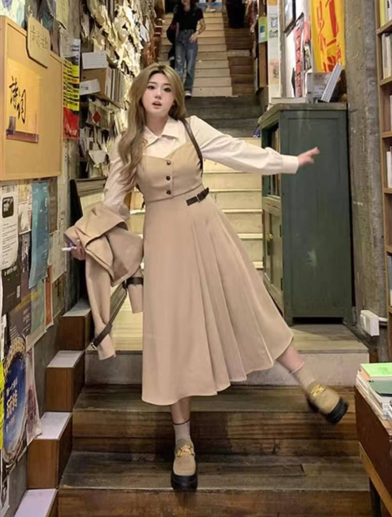 大码娃娃领减龄设计感马甲拼接假两件连衣裙显瘦文艺风
