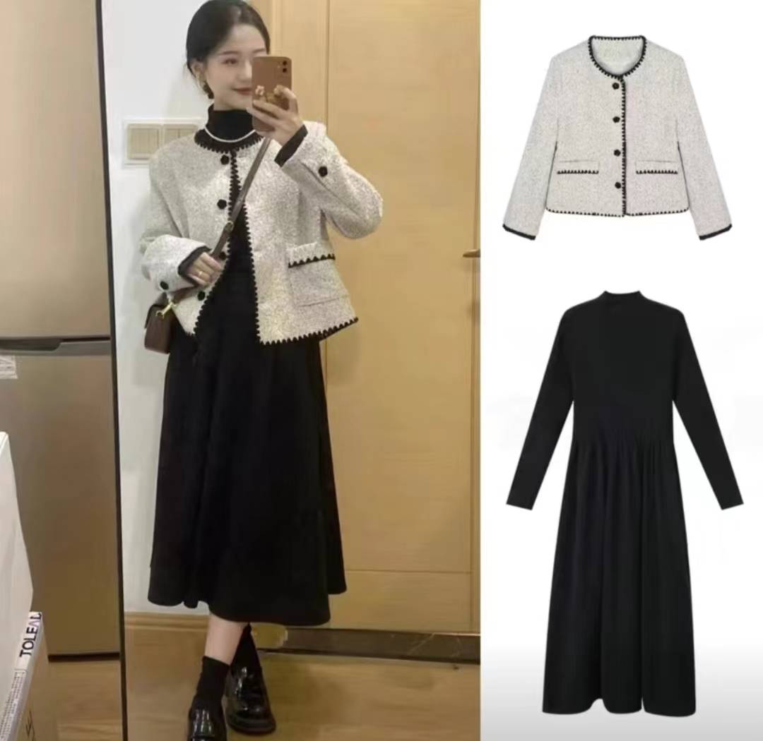大码秋冬新款小香风名媛外套+黑色打底连衣裙两件套