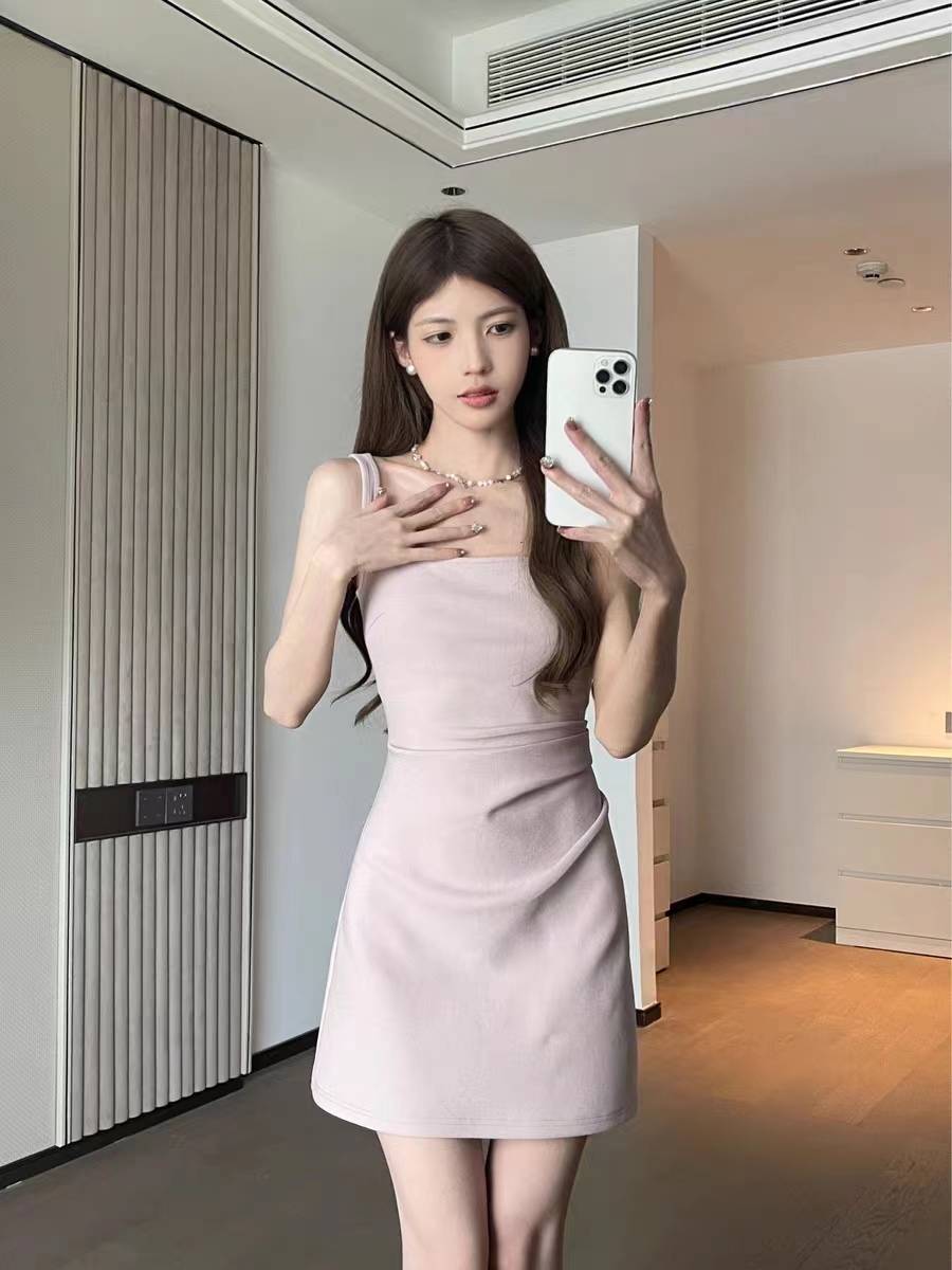 松本丧丧吊带连衣裙秋装女2023年新款温柔风收腰显瘦褶皱中长裙子