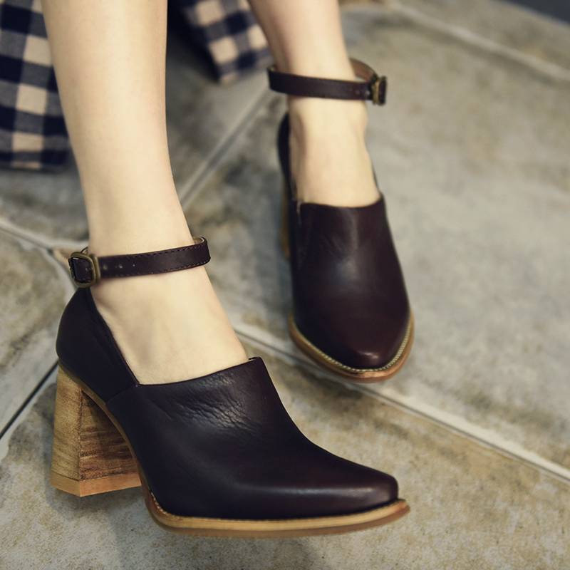 2018春季新款原创手工真皮女鞋欧美粗高跟尖头搭扣深口鞋单鞋