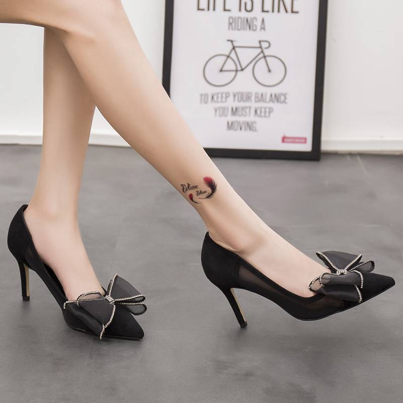 黑色真皮透气网面尖头细中高跟网纱蝴蝶结细钻浅口小码性感女单鞋