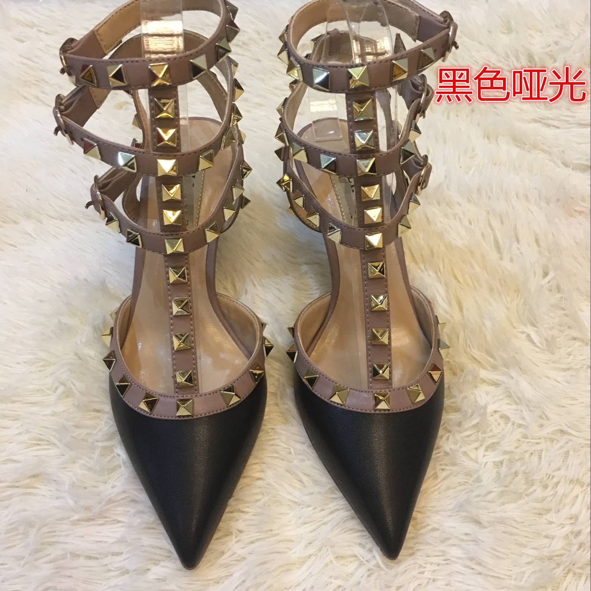 铆钉尖头高跟鞋柳丁细跟高跟绑带真皮凉鞋2018新款女伴娘婚鞋