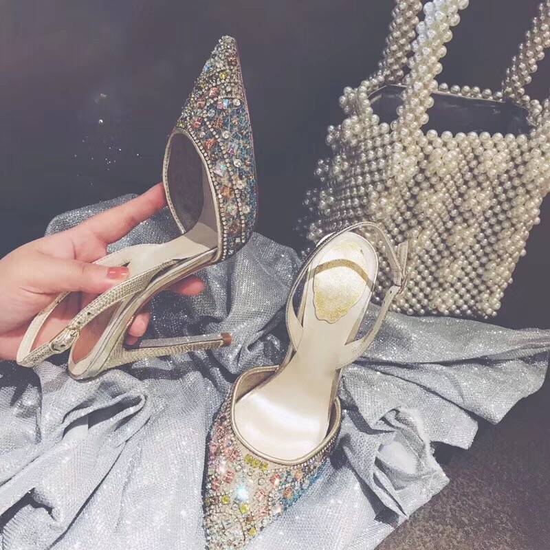 2018夏季新款包头尖头网布蕾丝欧美水钻中空后绊带细跟高跟女凉鞋