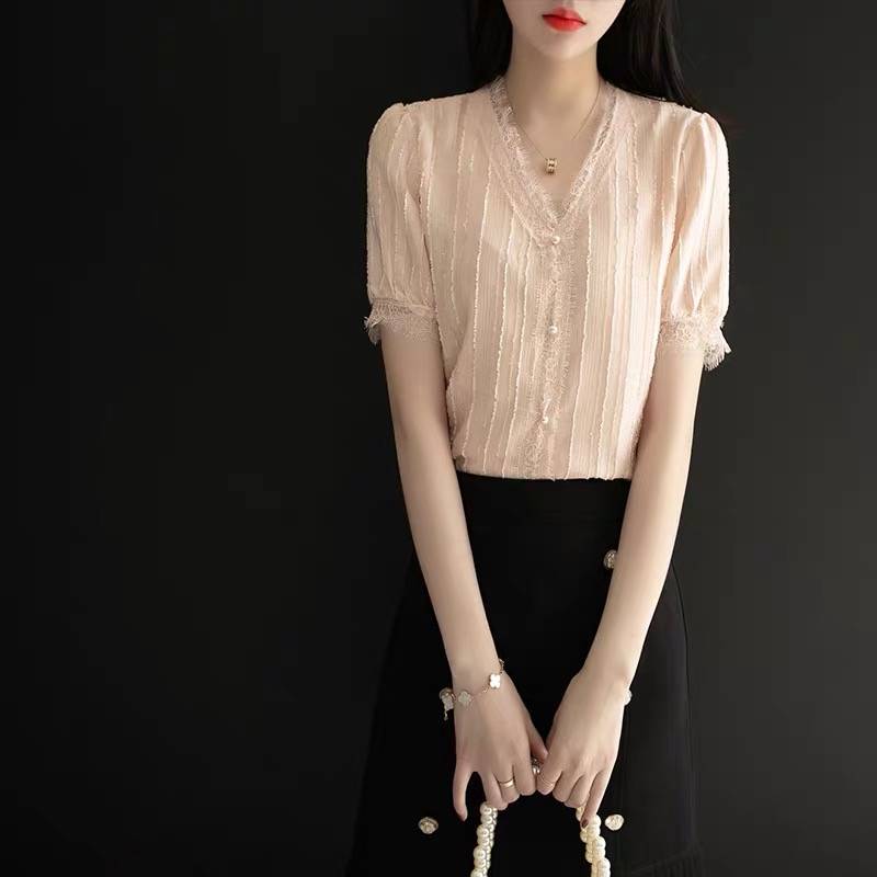 洋气衬衫女新款2020年夏季雪纺衫短袖v领睫毛蕾丝打底衫气质上衣