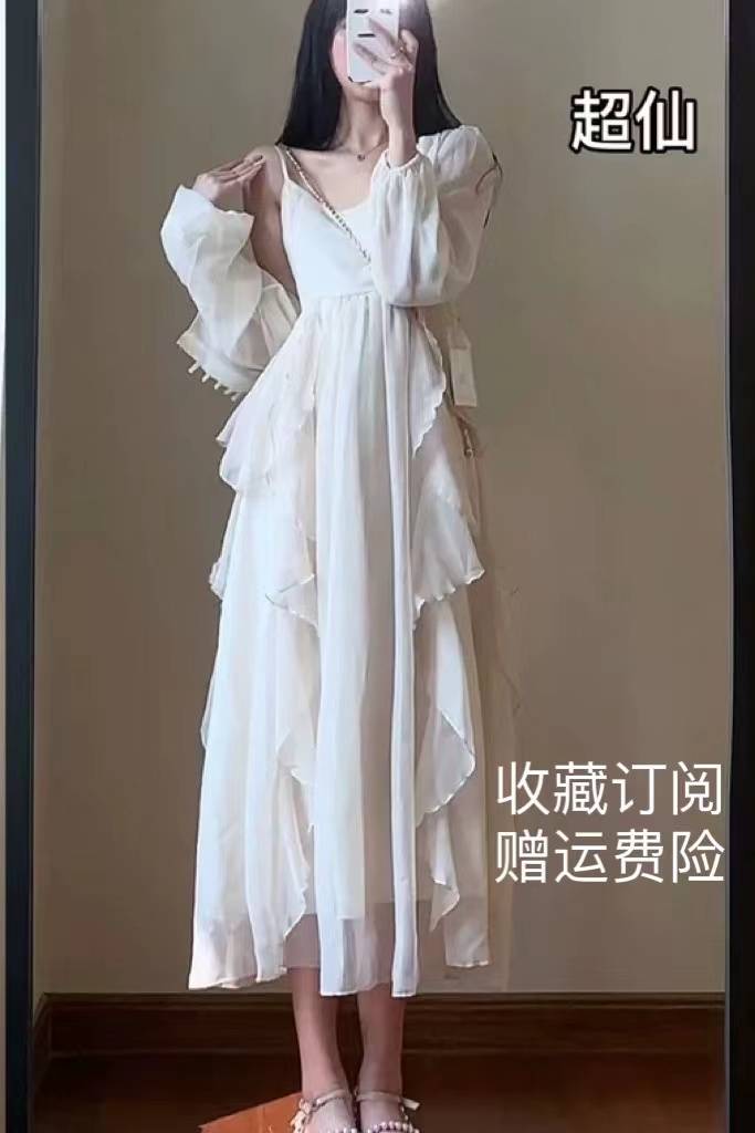 法式小众超仙度假连衣裙高级感吊带裙气质温柔长袖披肩夏季两件套