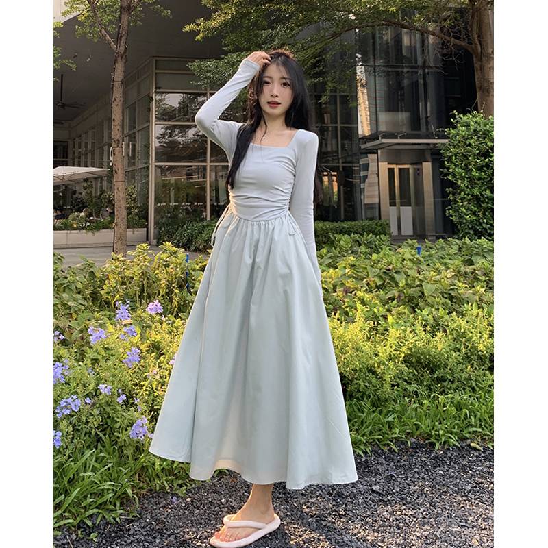 方领连衣裙女秋装2022年新款长裙气质显瘦设计感小众针织拼接裙子
