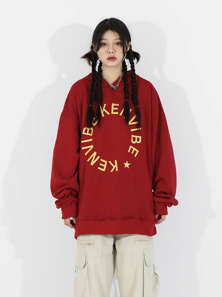 野生阿子美式潮牌酒红色连帽卫衣女星星印花原创设计2022秋季新款
