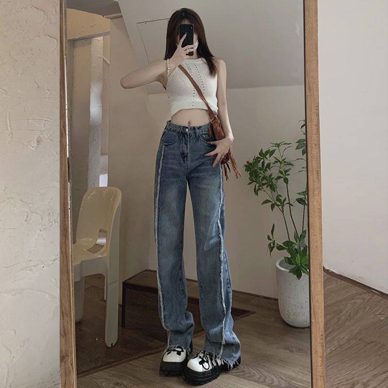 HELLO KOMA夏季韩版新款设计感港味牛仔裤女百搭显瘦宽松直筒长裤